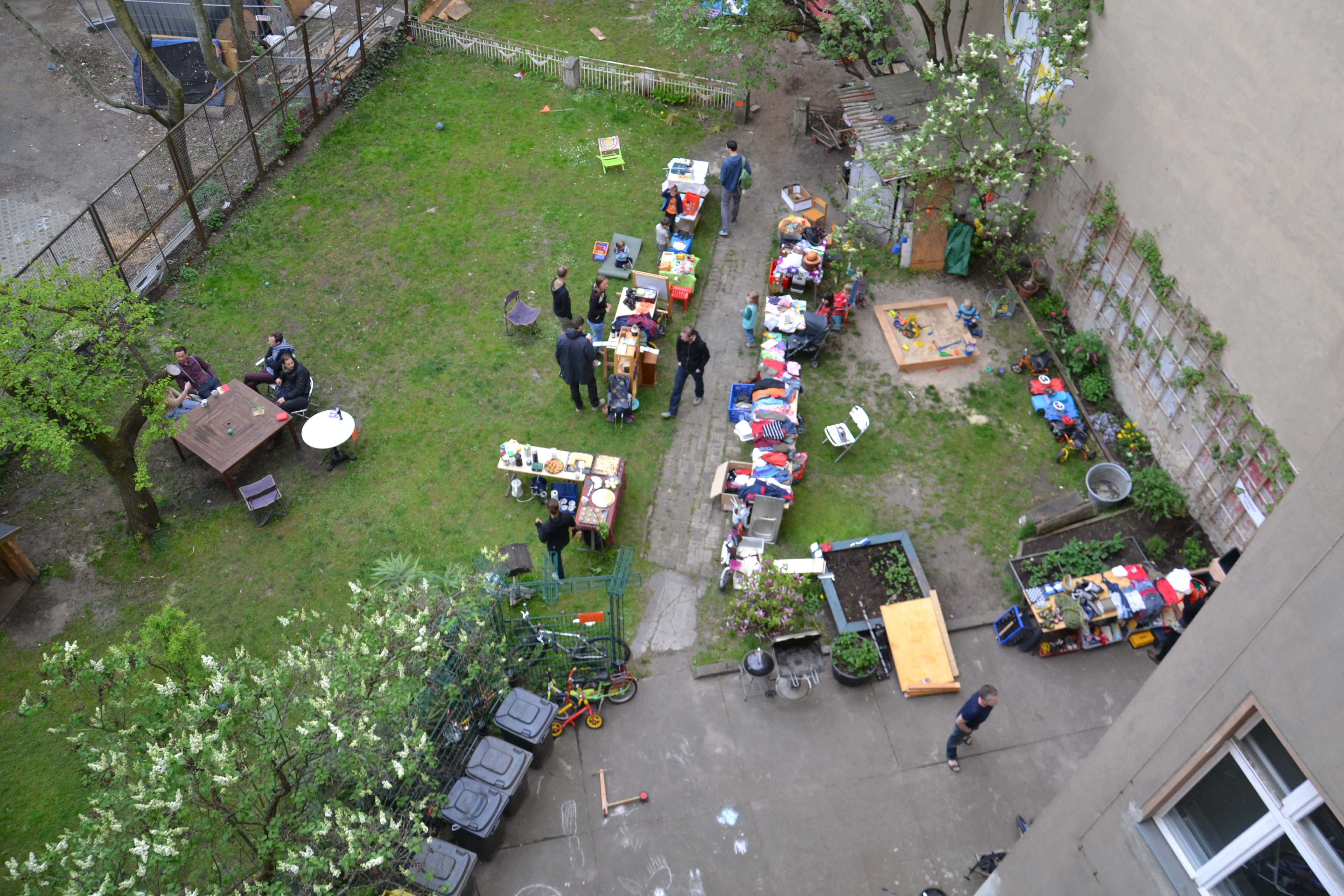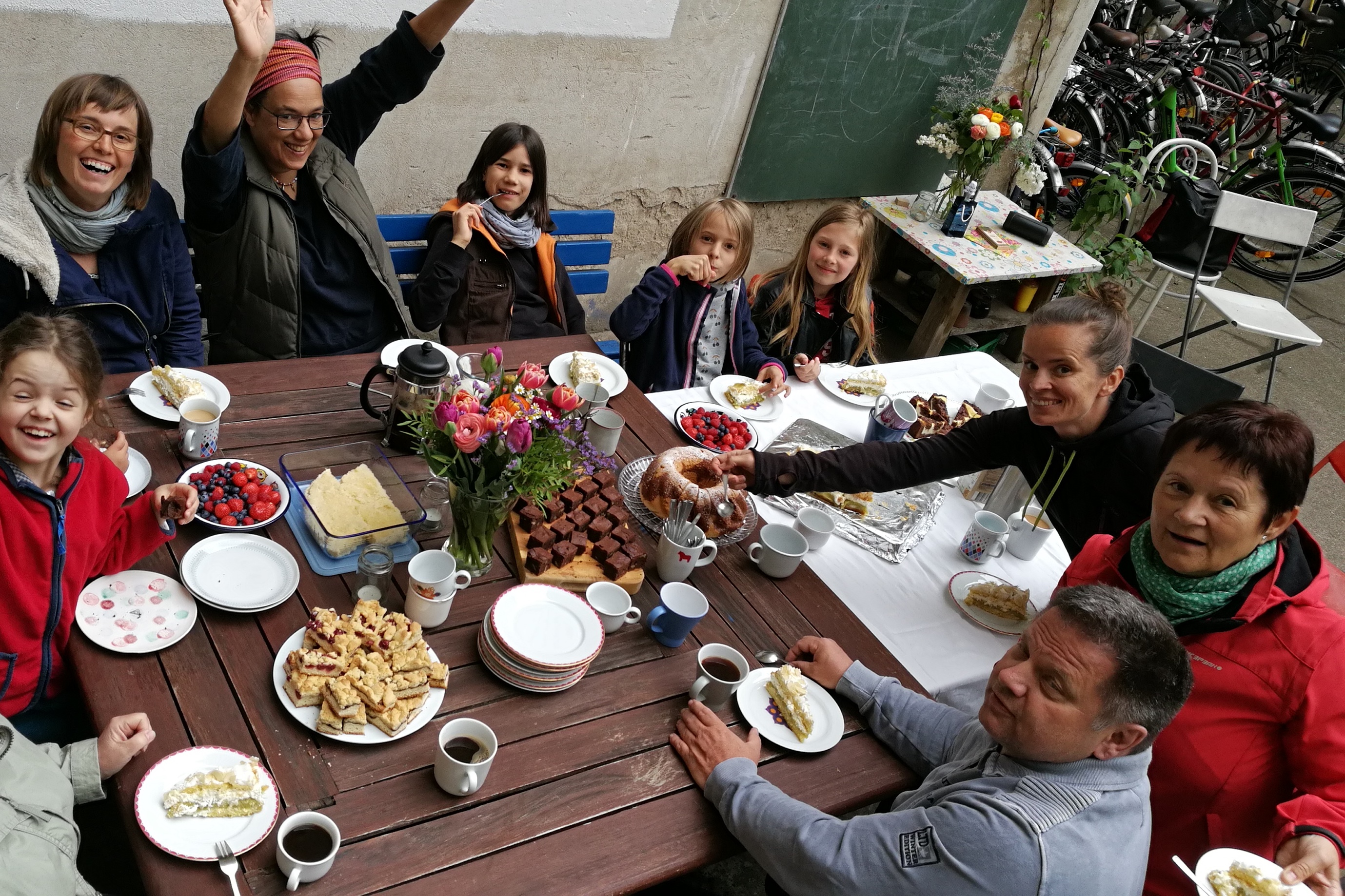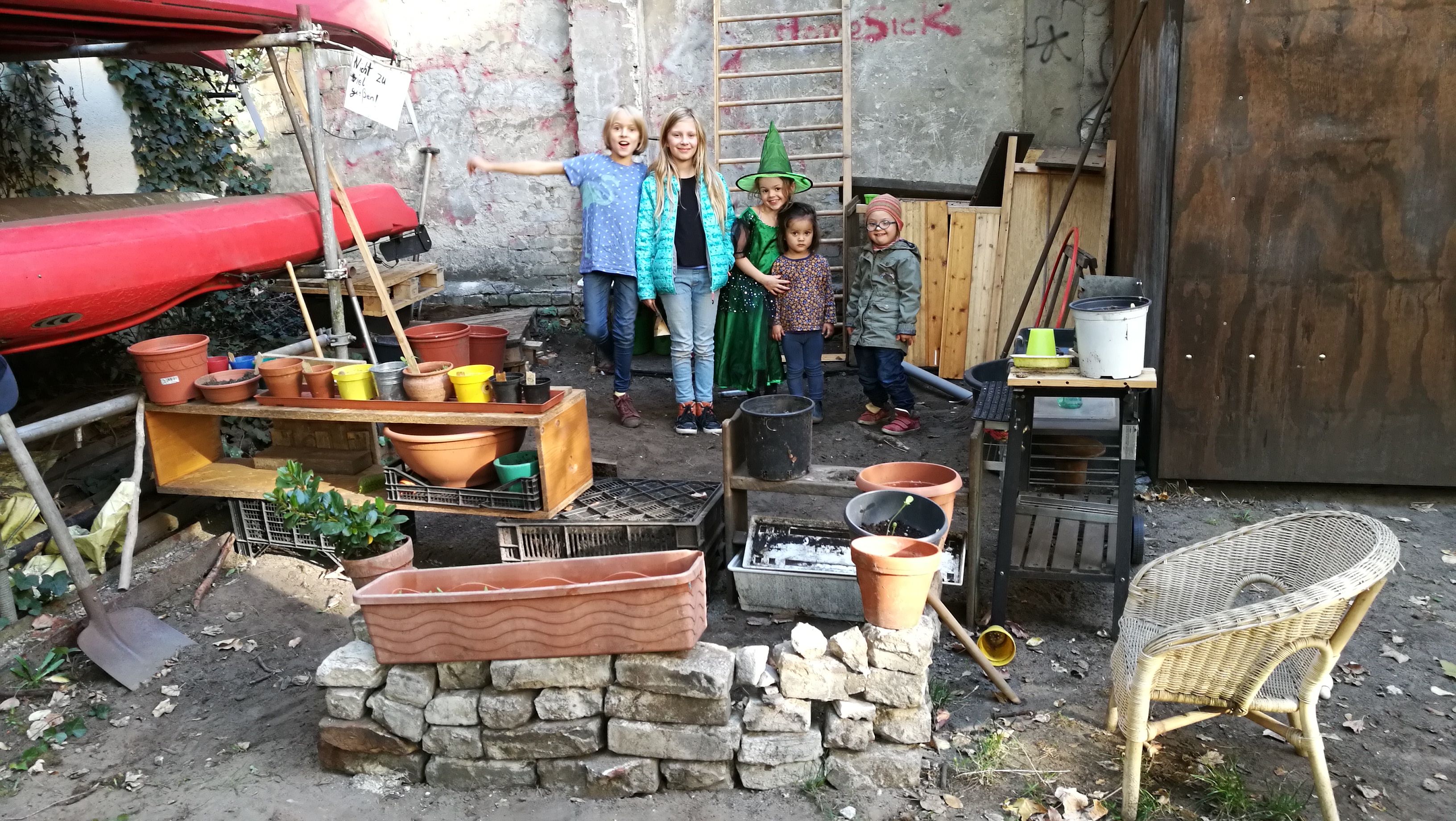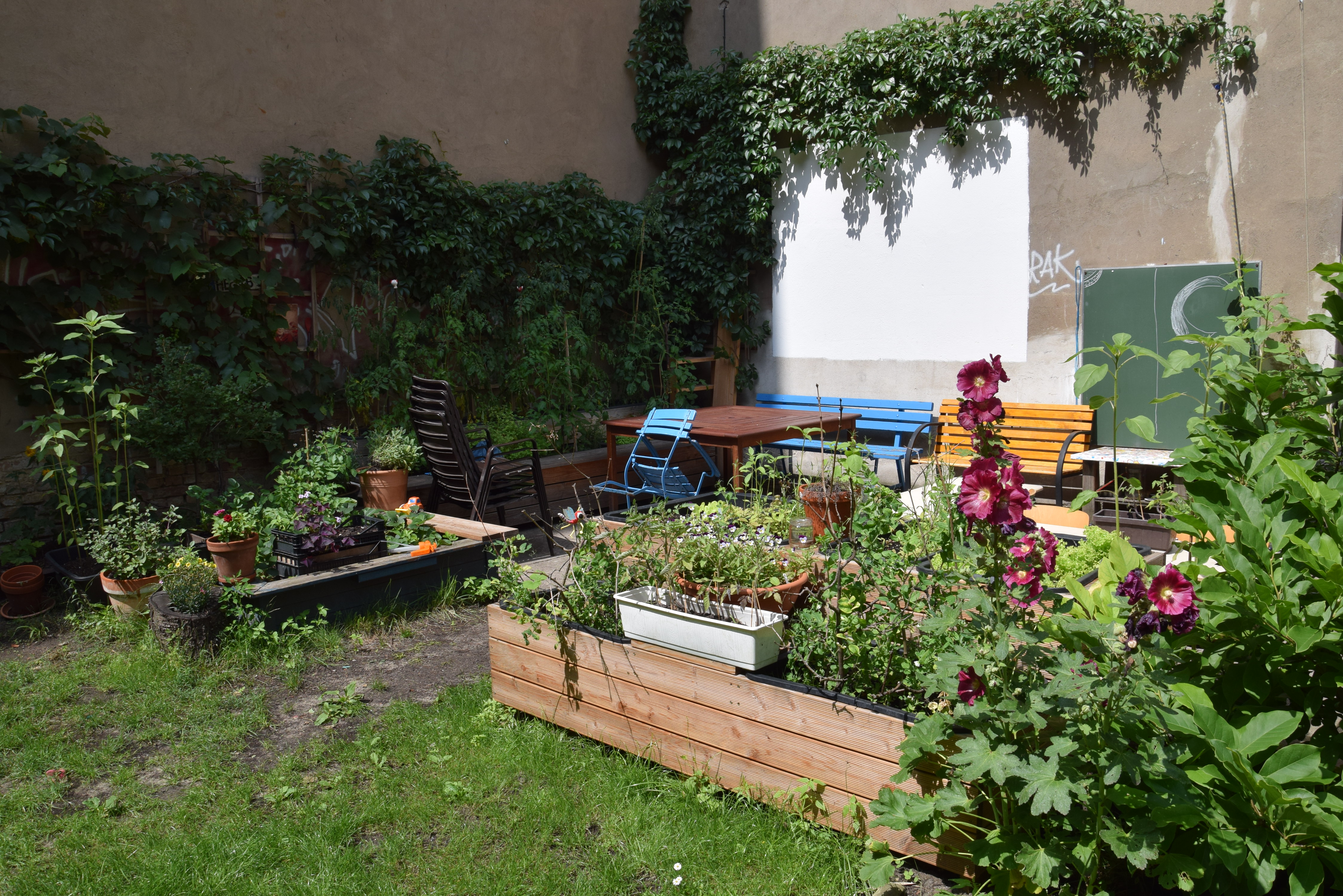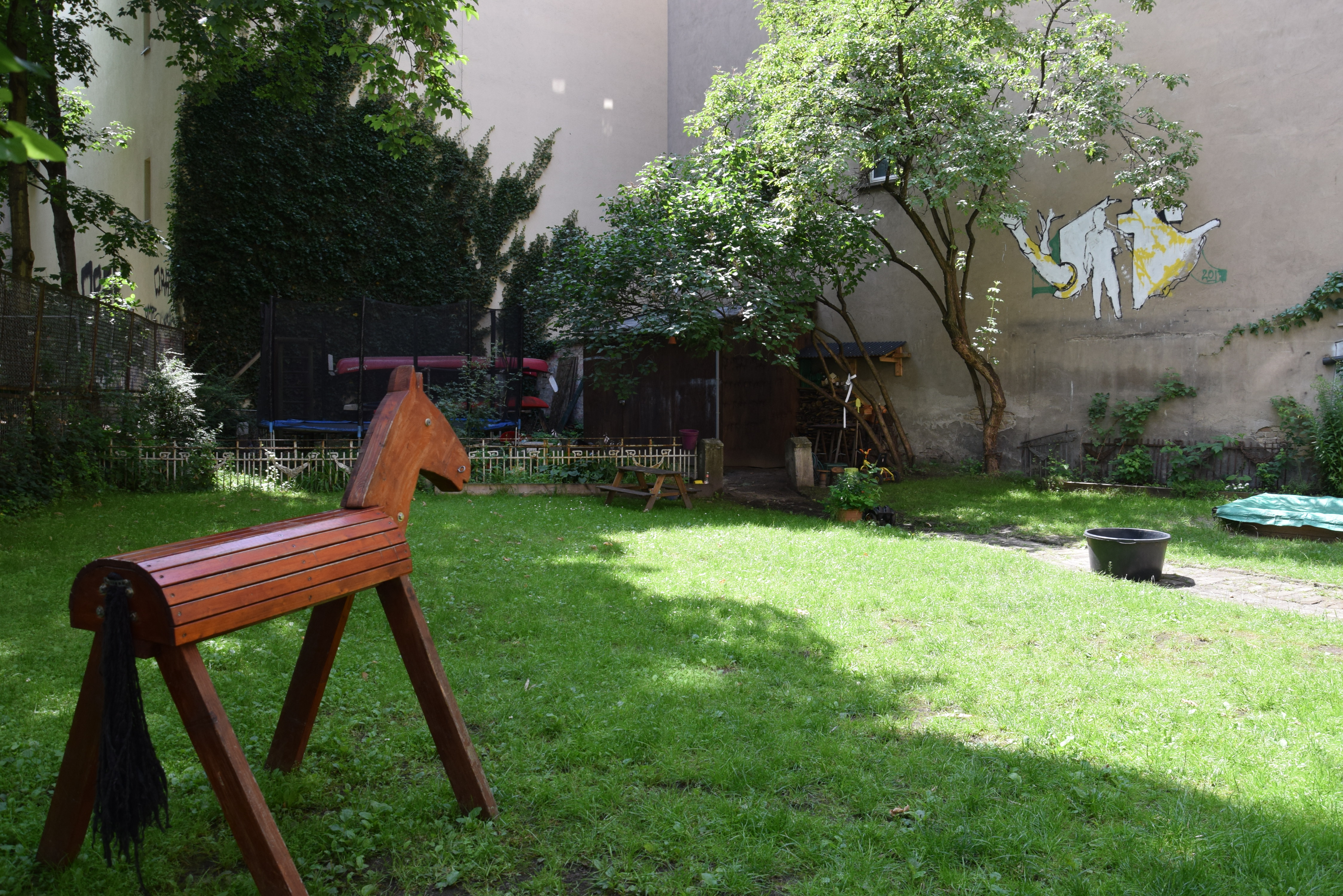 Das absolute Zentrum des Hauses ist der große, grüne Gemeinschaftshof mit seinem alten Aprikosenbaum, dem wildrankenden Wein, dem beeindruckenden Bambus und vielen Blumen- und Gemüsebeeten. Hier wurde in den letzten 10 Jahren durch die Nachbarschaft ein Ort von unschätzbarem Wert geschaffen. Unsere zehn Kinder verbringen ganze Tage auf dem Trampolin und auf den Bäumen, man liest in der Hängematte, trinkt ein Bier mit den Nachbarn, philosophiert bis tief in die Nacht über das Leben oder sieht einfach der Meise beim Nestbau zu.