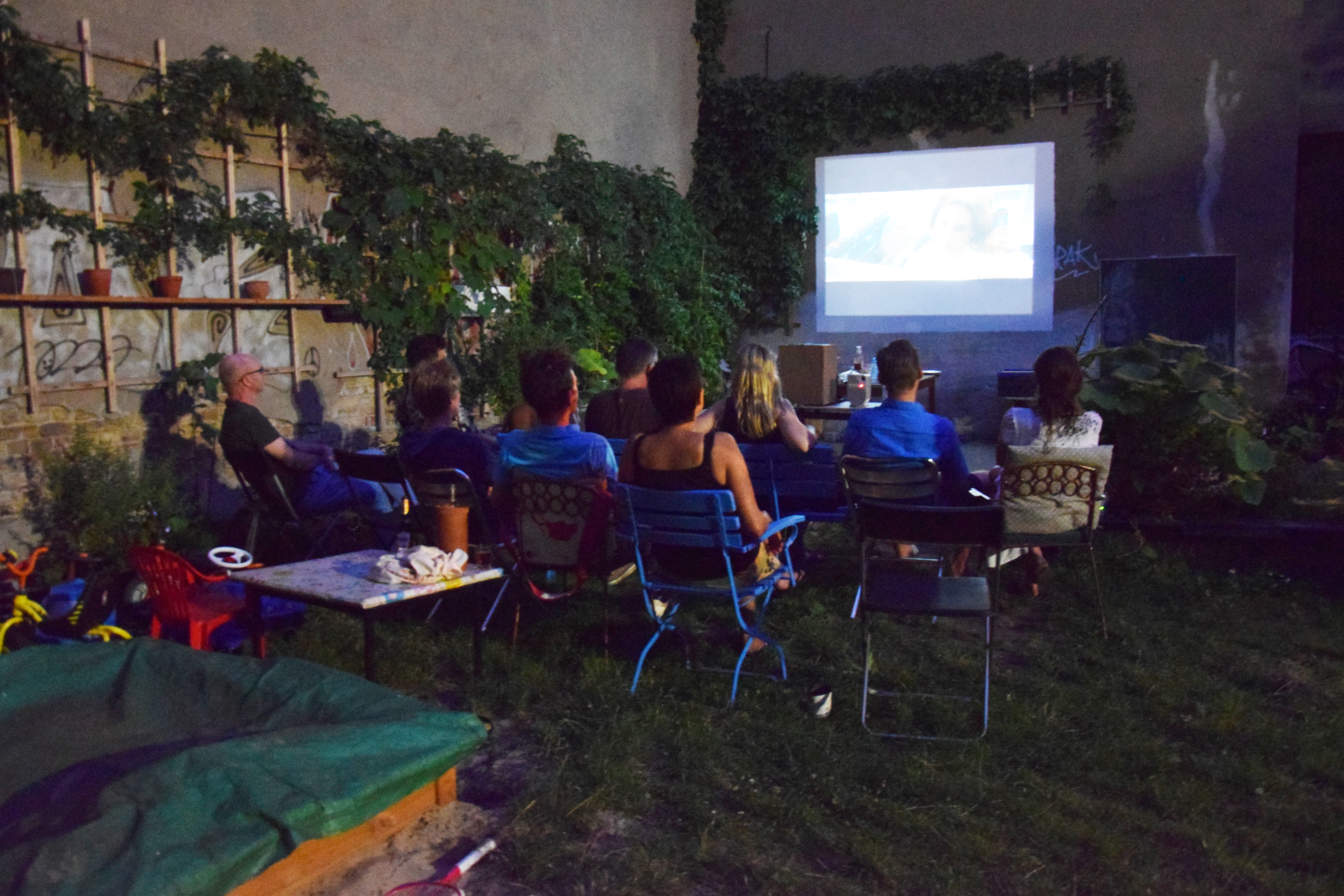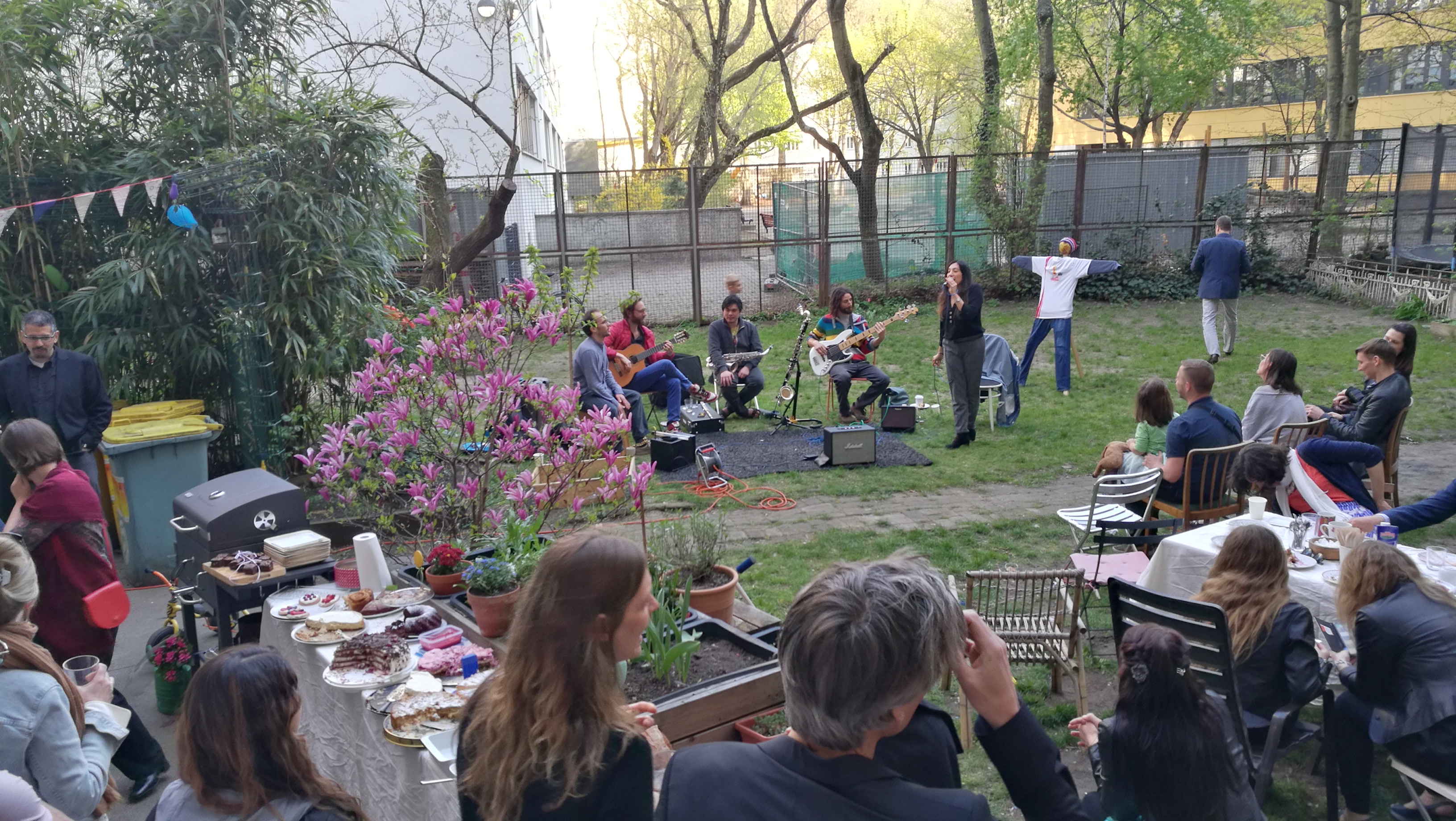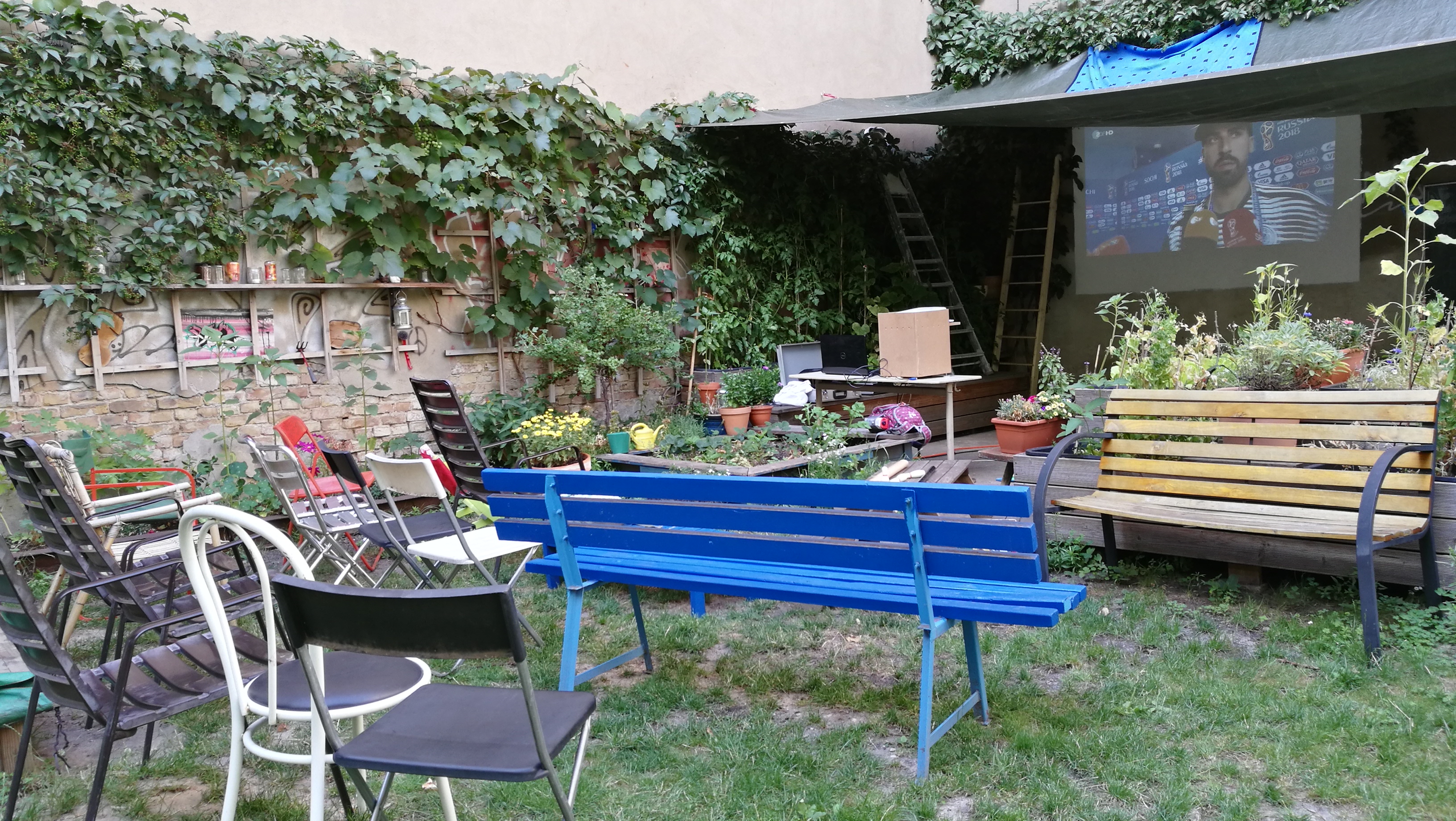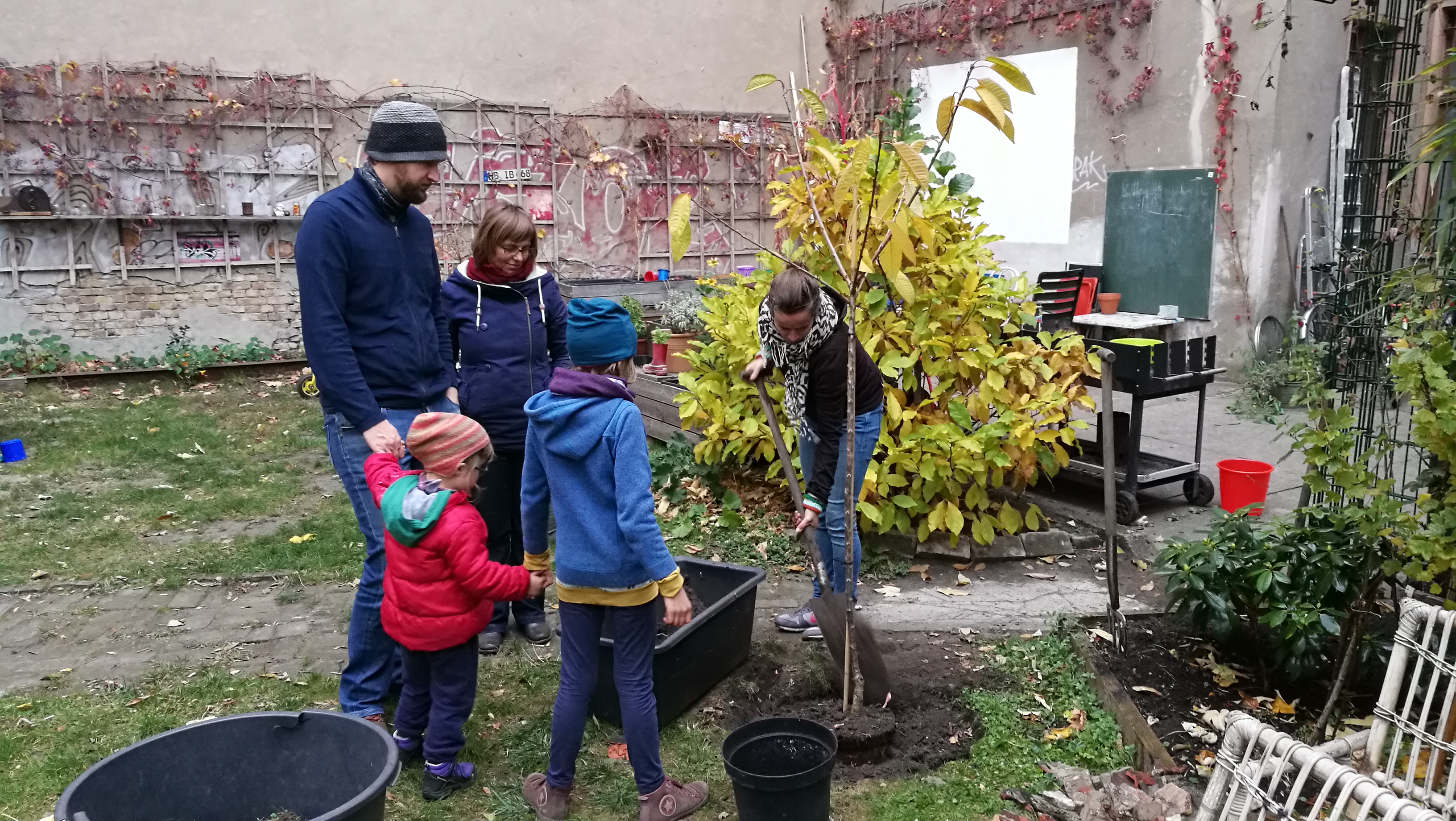 Das absolute Zentrum des Hauses ist der große, grüne Gemeinschaftshof mit seinem alten Aprikosenbaum, dem wildrankenden Wein, dem beeindruckenden Bambus und vielen Blumen- und Gemüsebeeten. Hier wurde in den letzten 10 Jahren durch die Nachbarschaft ein Ort von unschätzbarem Wert geschaffen. Unsere zehn Kinder verbringen ganze Tage auf dem Trampolin und auf den Bäumen, man liest in der Hängematte, trinkt ein Bier mit den Nachbarn, philosophiert bis tief in die Nacht über das Leben oder sieht einfach der Meise beim Nestbau zu.