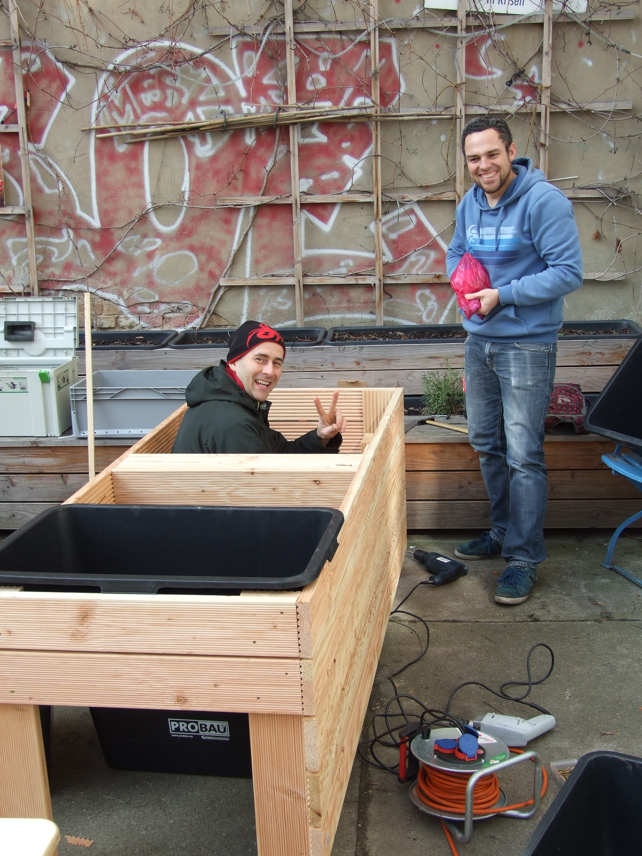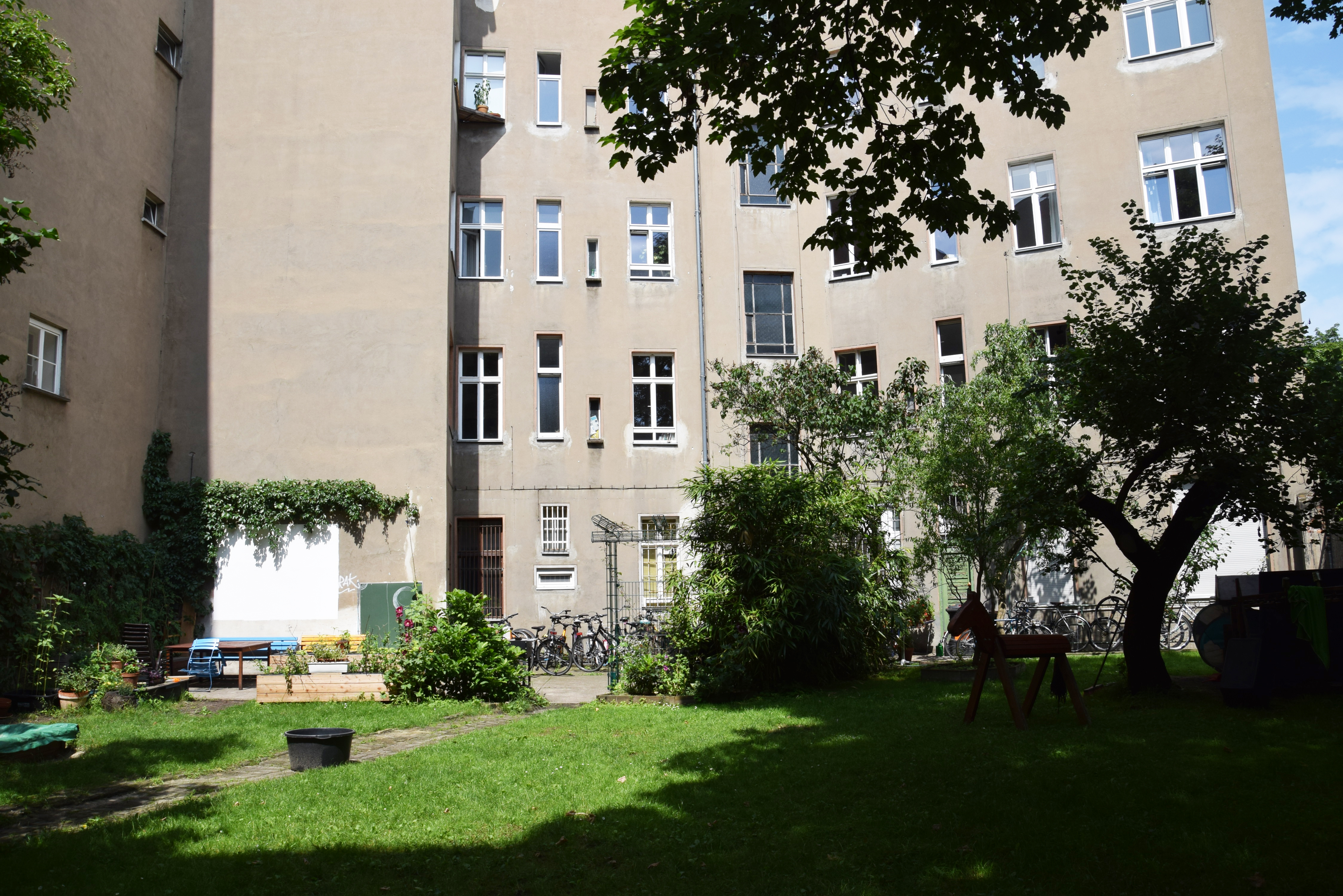 Unser Haus besteht aus 15 Wohn- und 4 Gewerbeeinheiten, darunter das beliebte Centopassi, bei dem sich im Sommer der halbe Kiez tummelt. Im Hinterhof treffen sich die Hausbewohner*innen mit Freund*innen und Nachbar*innen zum Grillen, Kinder spielen, Blumen und Gemüse wachsen in den Beeten – grüne Lebensqualität mitten in der Stadt. Das war nicht immer so: Der Hof glich früher einer Baustelle, doch durch viel Eigeninitiative und Engagement der Wohnenden entstand ein Treffpunkt für die Hausgemeinschaft.