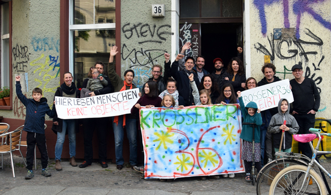 Die Hausgemeinschaft der Bewohner*innen der Krossener Straße 36 in Berlin im Milieuschutzgebiet Boxhagener Platz.
